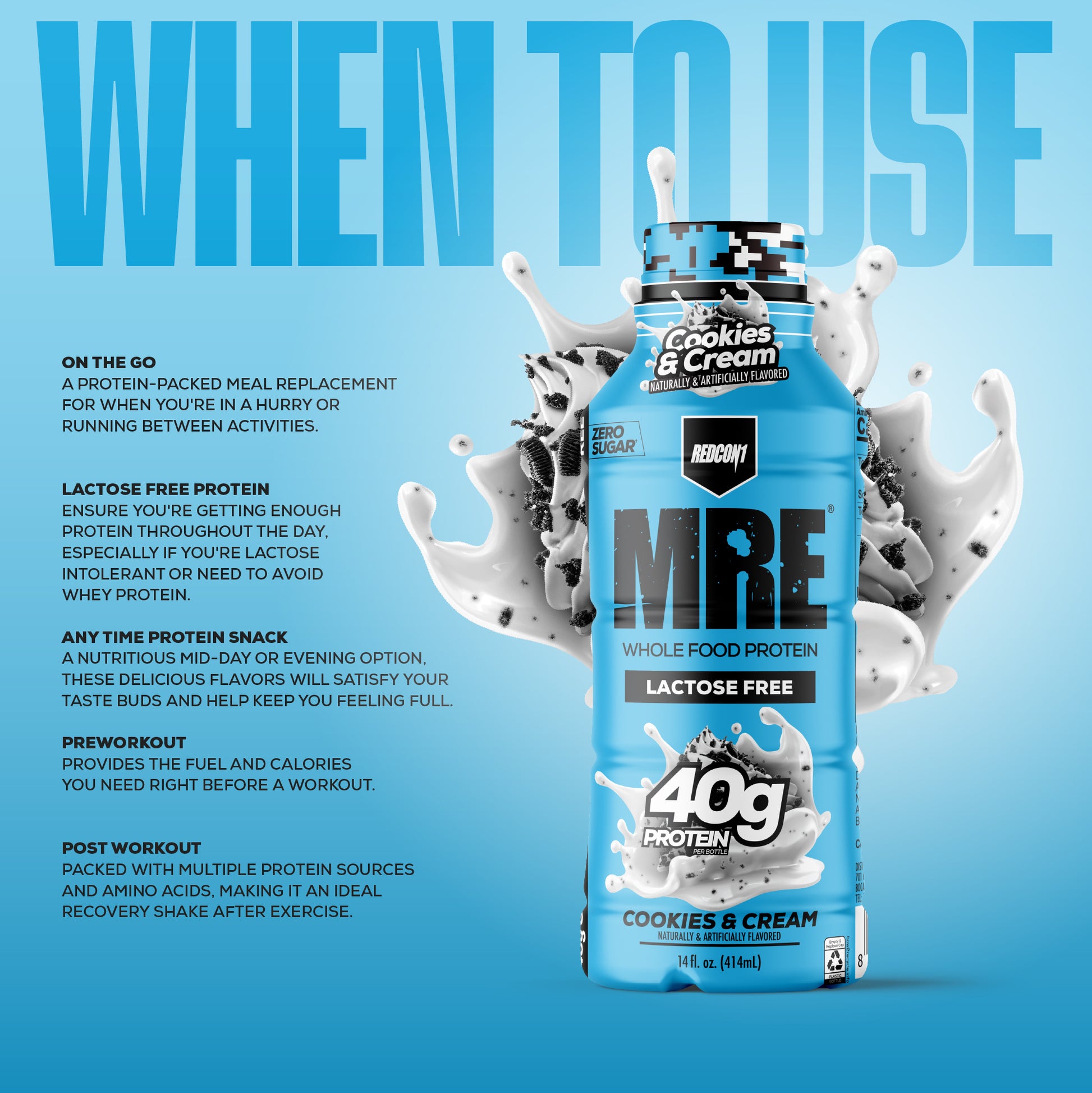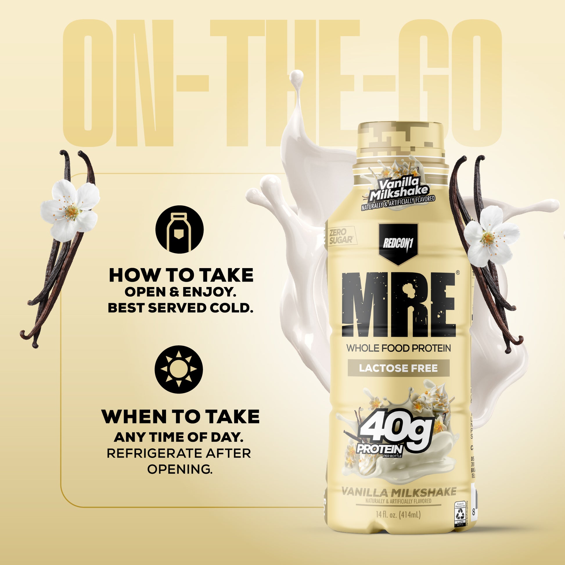 The MRE protein line is built off the premise that ‘real food protein is the most important fuel you can give your body.’ MRE Protein Shake is a convenient ready-to-drink protein shake that is perfect for pre and post workout. ...