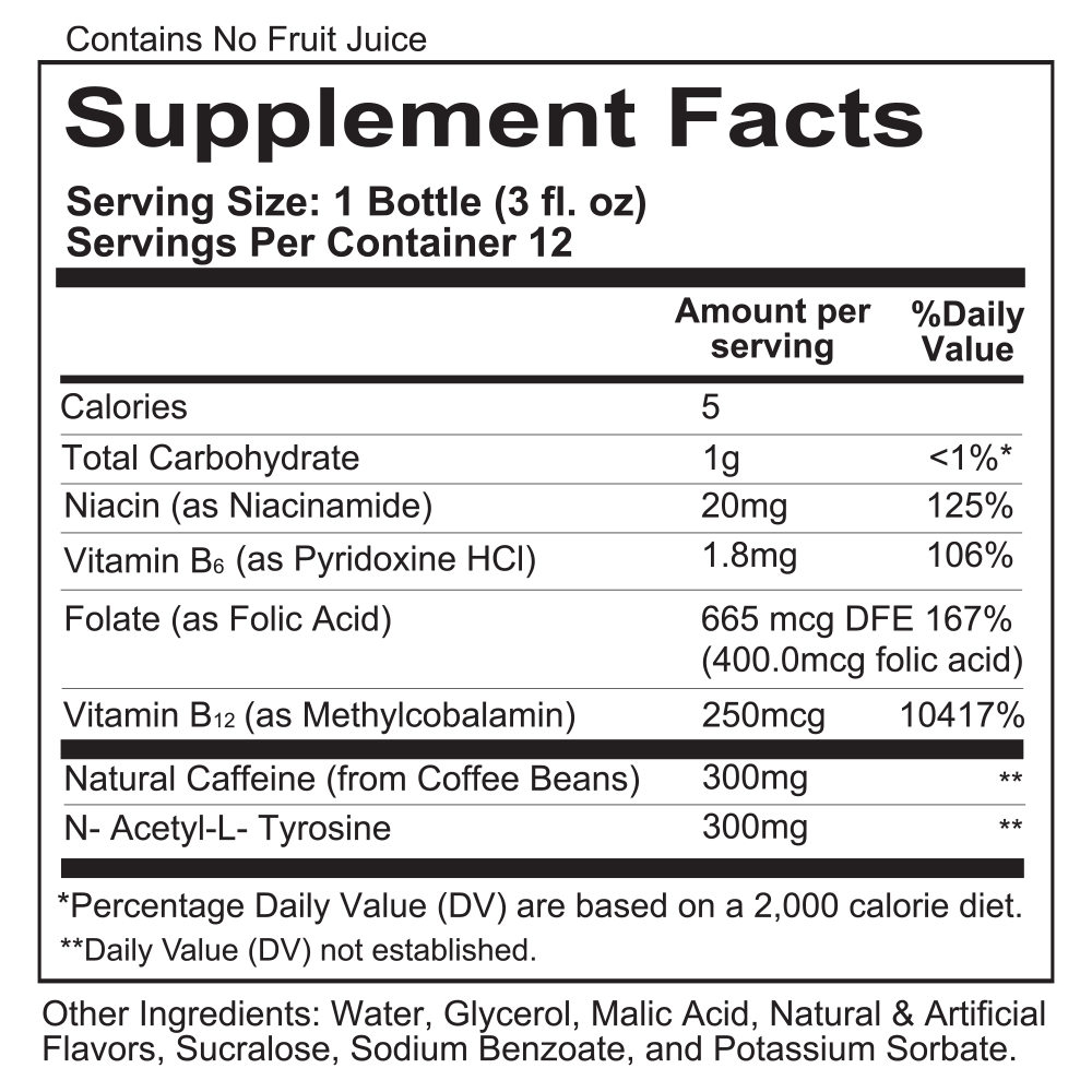 PACKAGED IN A CONVENIENT 3OZ BOTTLE, EVERY SHOT FEATURES 300MG OF NATURAL CAFFEINE AND B-VITAMINS TO DELIVER ULTIMATE ENERGY AND HEIGHTENED FOCUS, KEEPING YOU SHARP AND ENERGIZED FOR THE LONG HAUL.